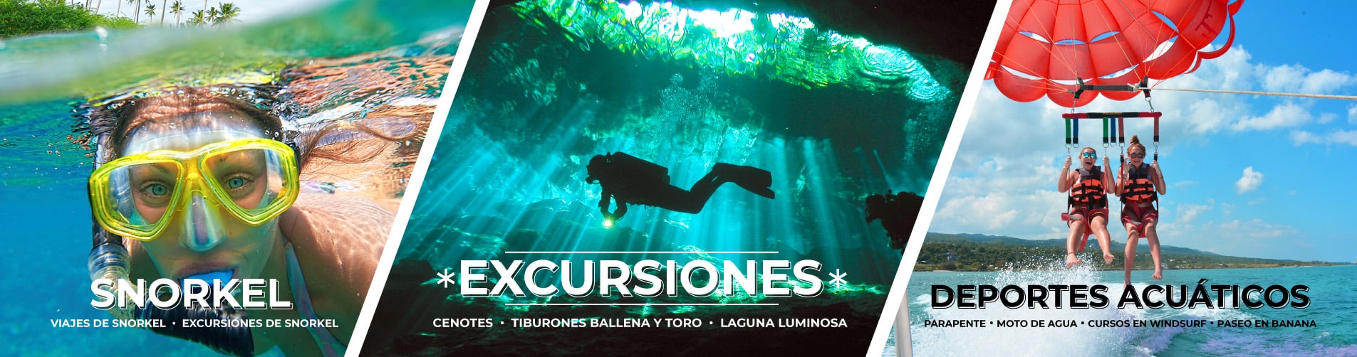 Ofrecemos muchas maneras de asegurarle unas vacaciones plenas de actividad. Todos nuestros centros de buceo y snorkel en el Caribe ofrecen excursiones a lugares reconocidos por su excepcional belleza y aguas cristalinas. ¡El lugar perfecto para un viaje de un día de buceo o de snorkel! Sus arrecifes son famosos entre los practicantes de deportes acuáticos. Llegaremos a ellos en unas travesías excepcionales. ¿Le llevamos?